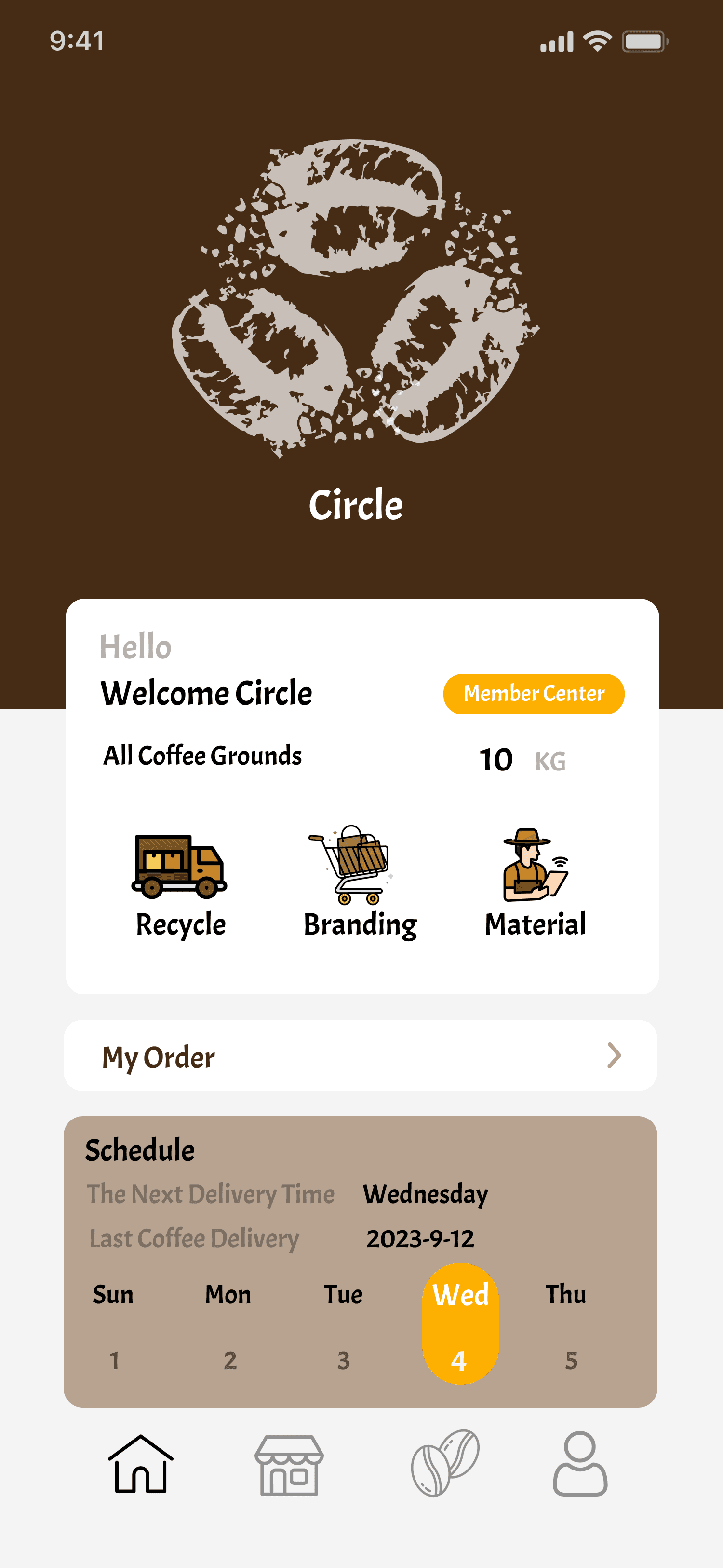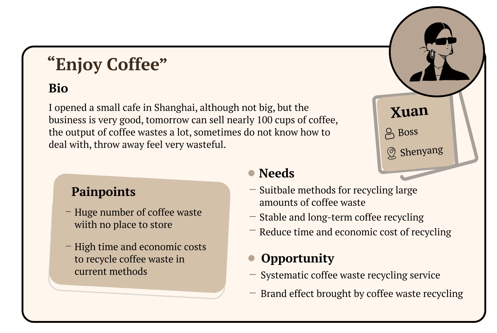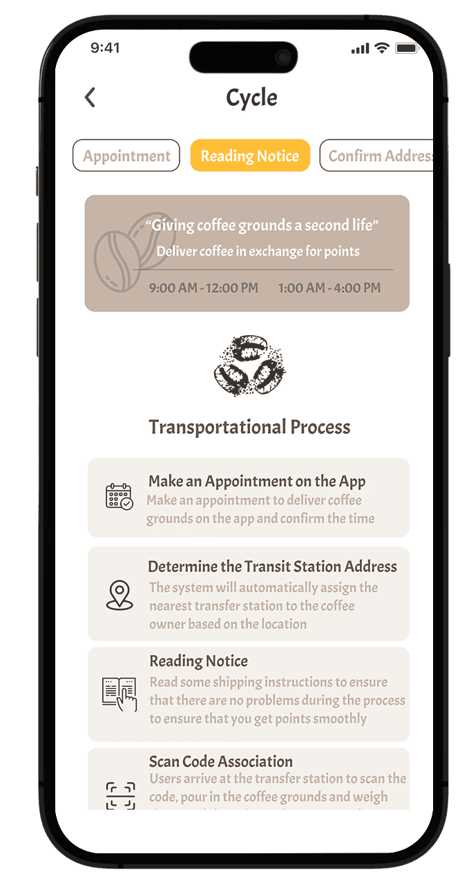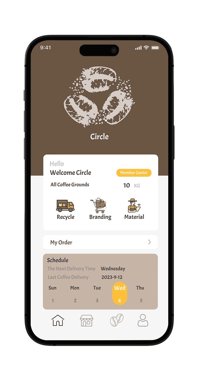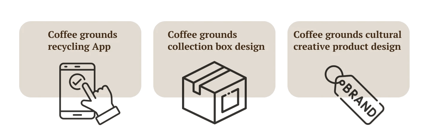 A closed-loop recycling system that connects users, coffee shops, farmers, and merchants—turning coffee grounds from everyday waste into a shared, reusable resource across the entire ecosystem.