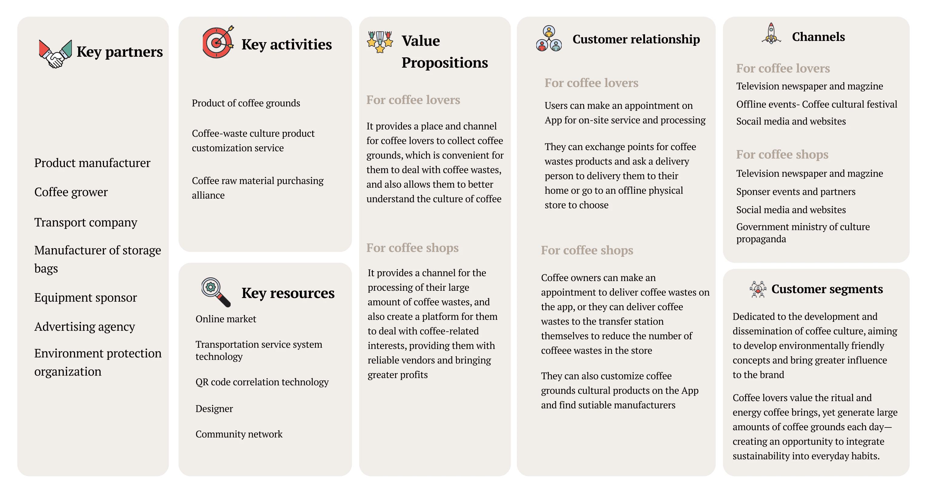 A system-level view of how coffee ground recycling creates value across users, partners, and channels. The model supports both individual participation and commercial scalability.