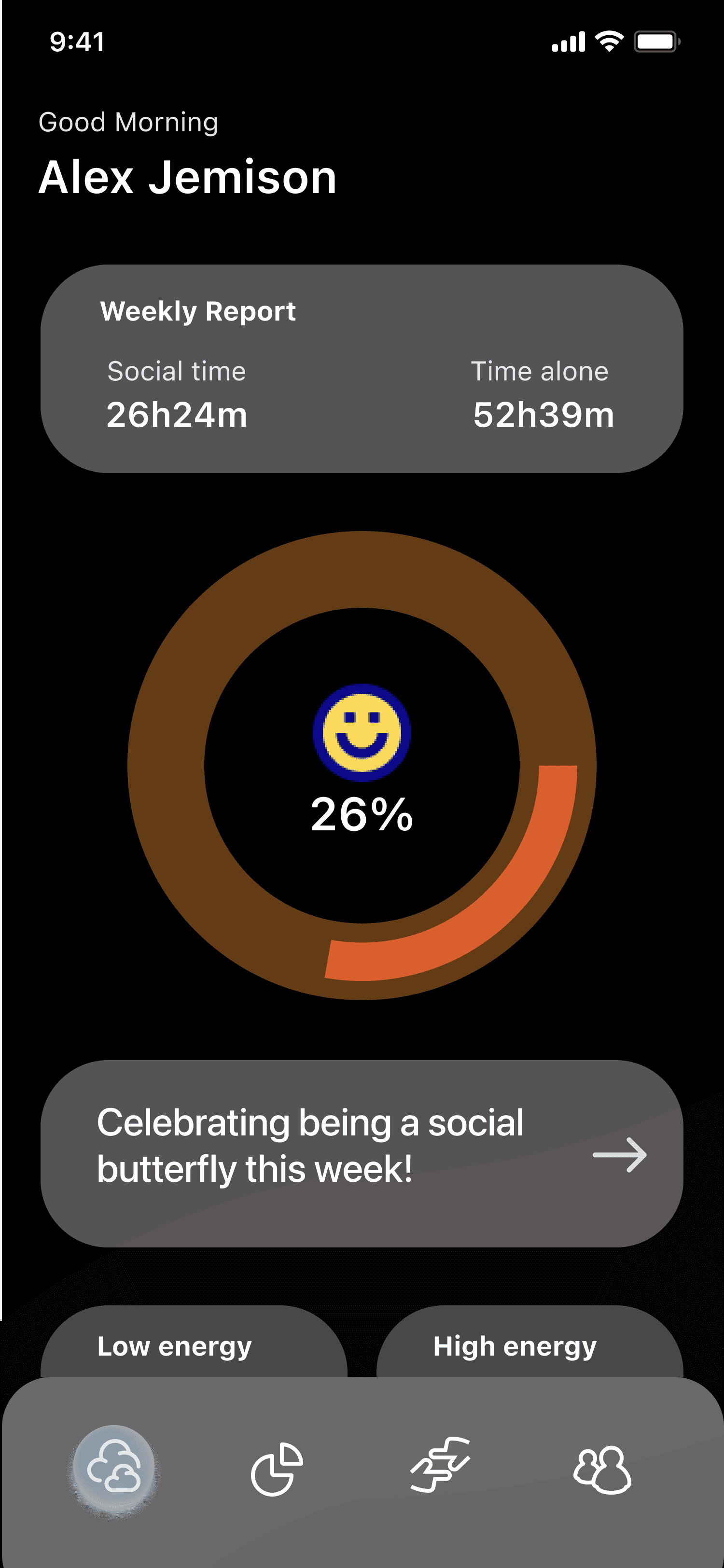 Social Cloud is a conceptual mobile experience that visualizes social energy through cloud-like forms. By combining quick emotional check-ins with body signals, it helps users understand whether they feel open to connection or need distance. The app supports three modes—Join, Observe, Stay Quiet—allowing users to set social boundaries without pressure.