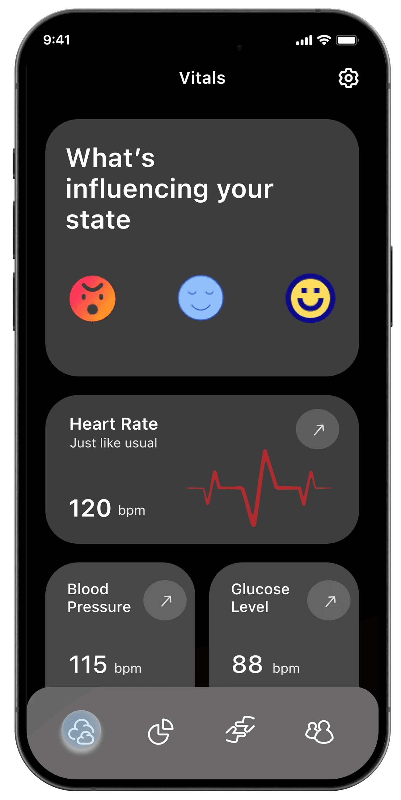 A companion app designed to support a wearable social-sensing device. It visualizes emotional states, contextual data, and interaction choices to reduce social pressure and encourage self-aware connection.