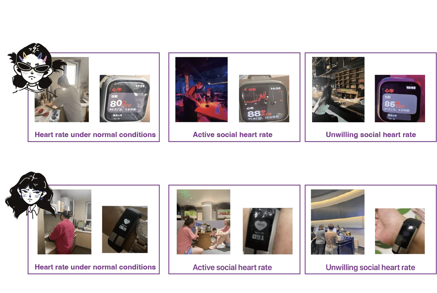 To test my idea, I followed two users, recorded their non-social and social scenes, and recorded their heart rate changes. I recorded the heartbeat changes of Zhou Li and Cao Gefei when they were at home, when they were socializing and when they were reluctant to communicate.